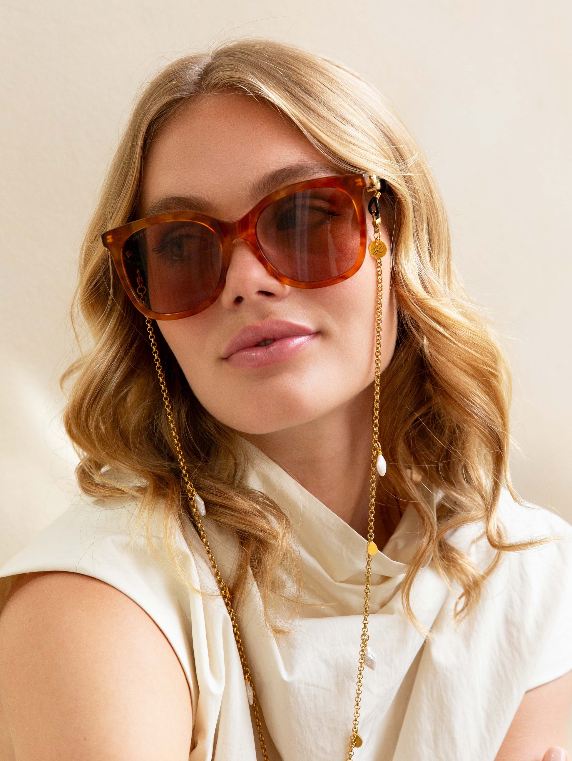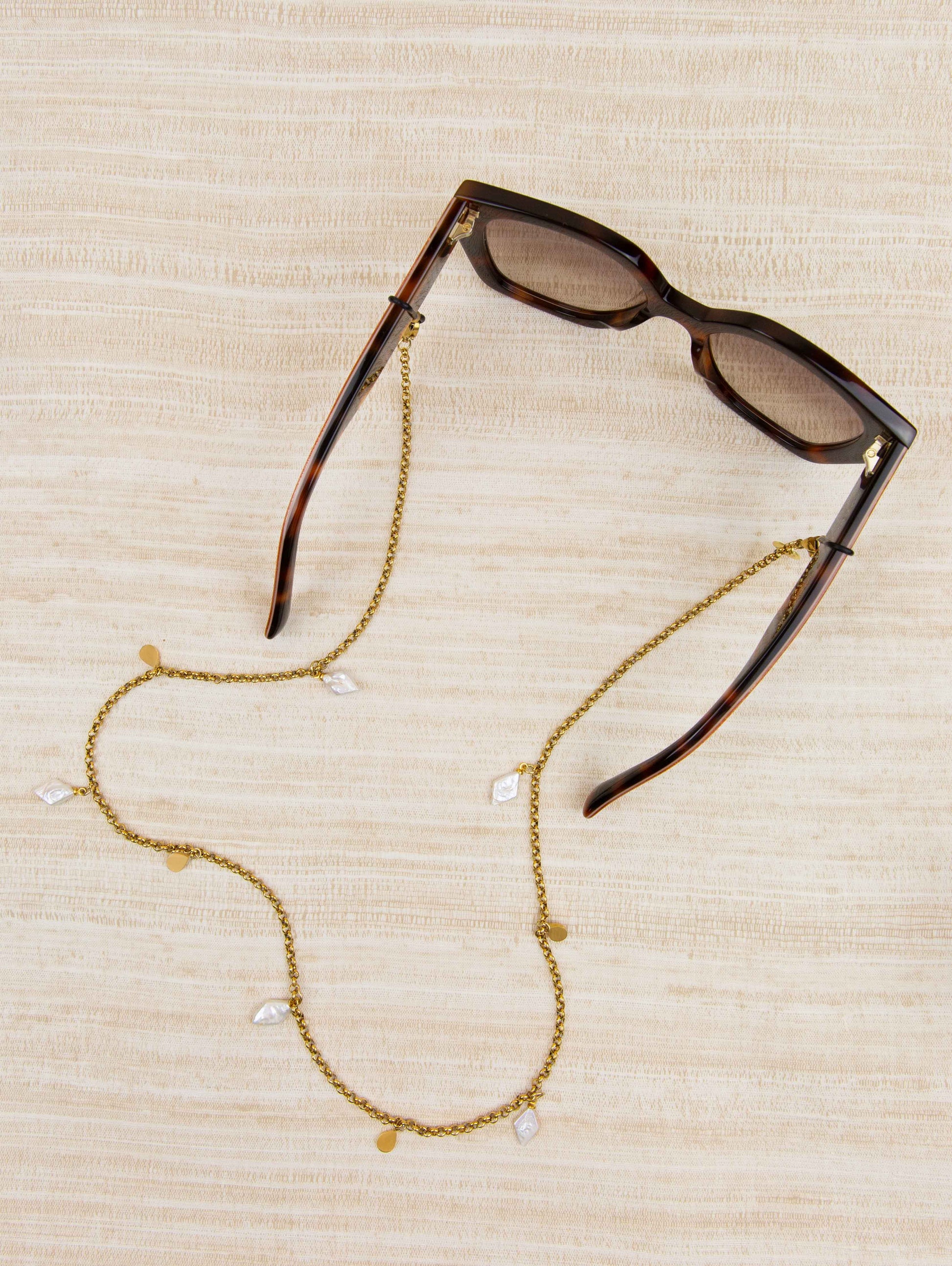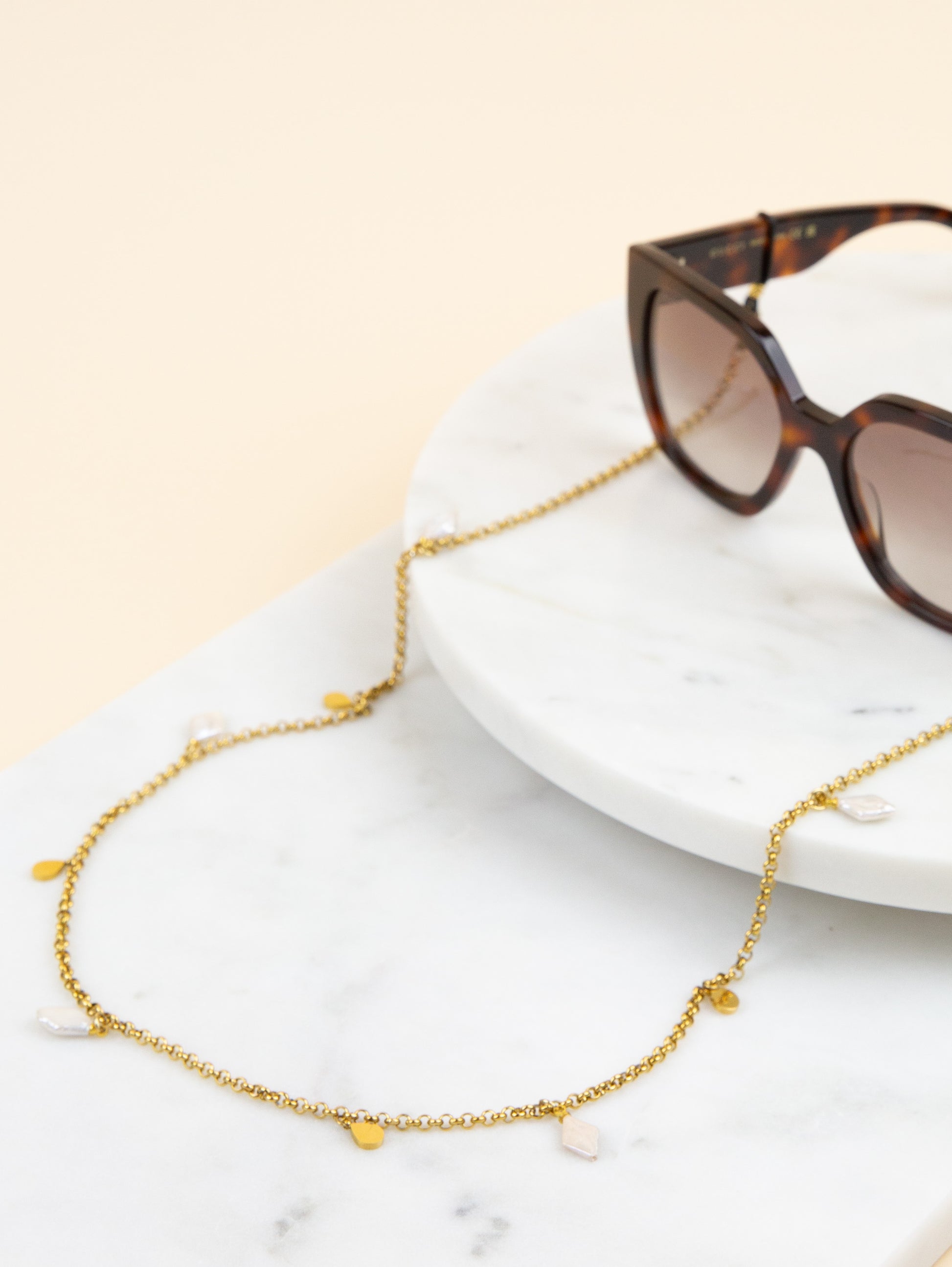 Introducing the sunglasses chain Ann, the timeless beauty. The Sunny Cord is designed with a combination of diamond shaped pearls and gold plated charms. Each pearl glisters, while the shimmering gold charms add a touch of luxury to any outfit.