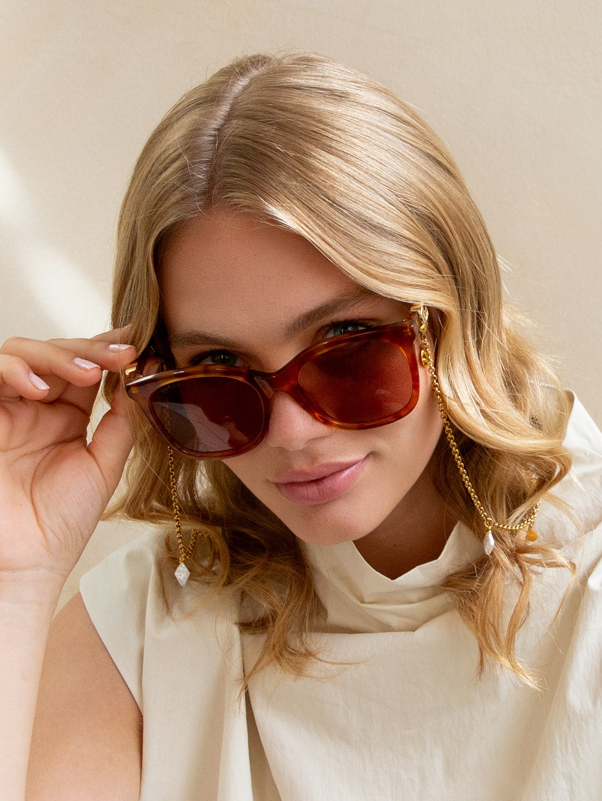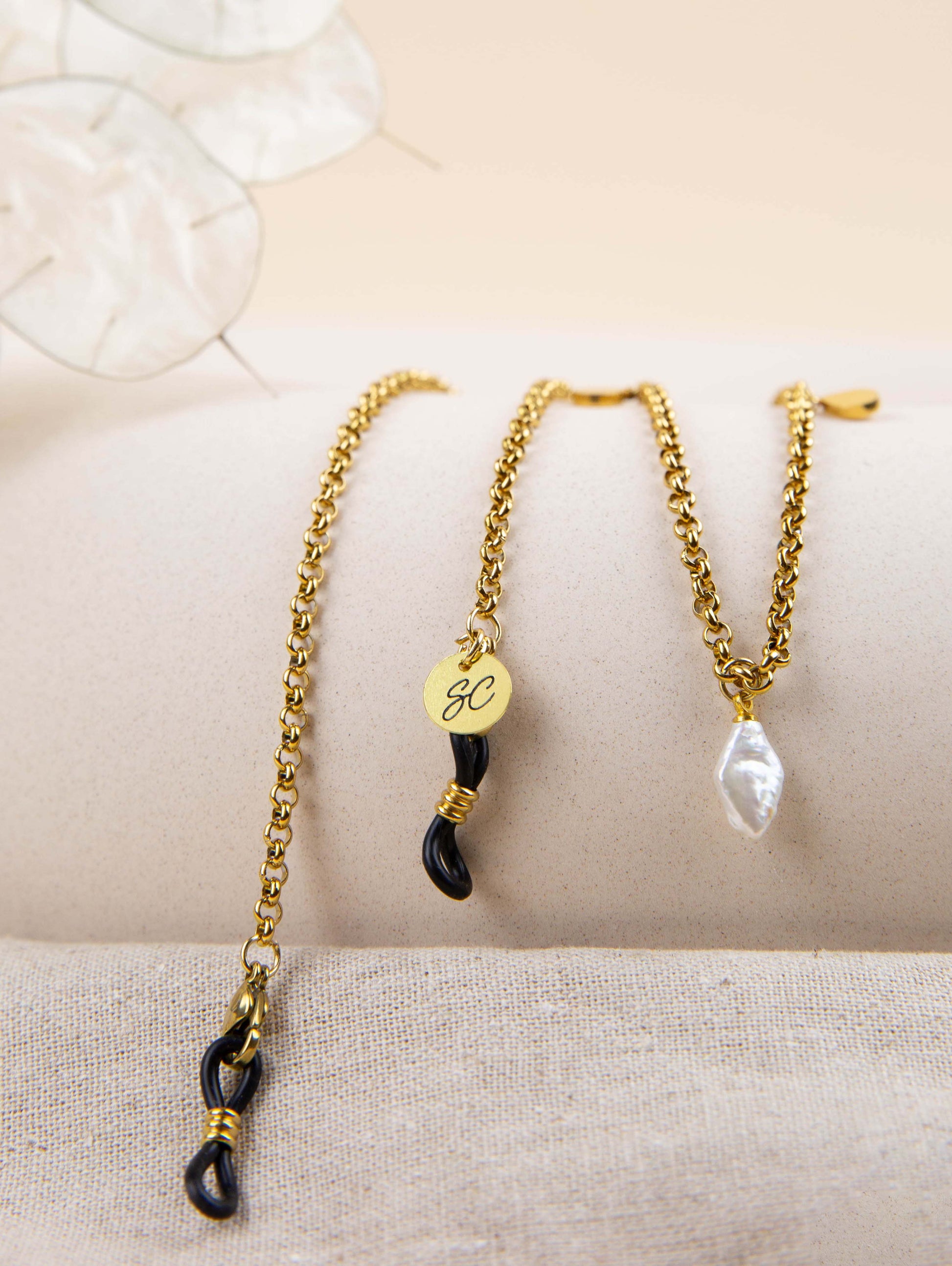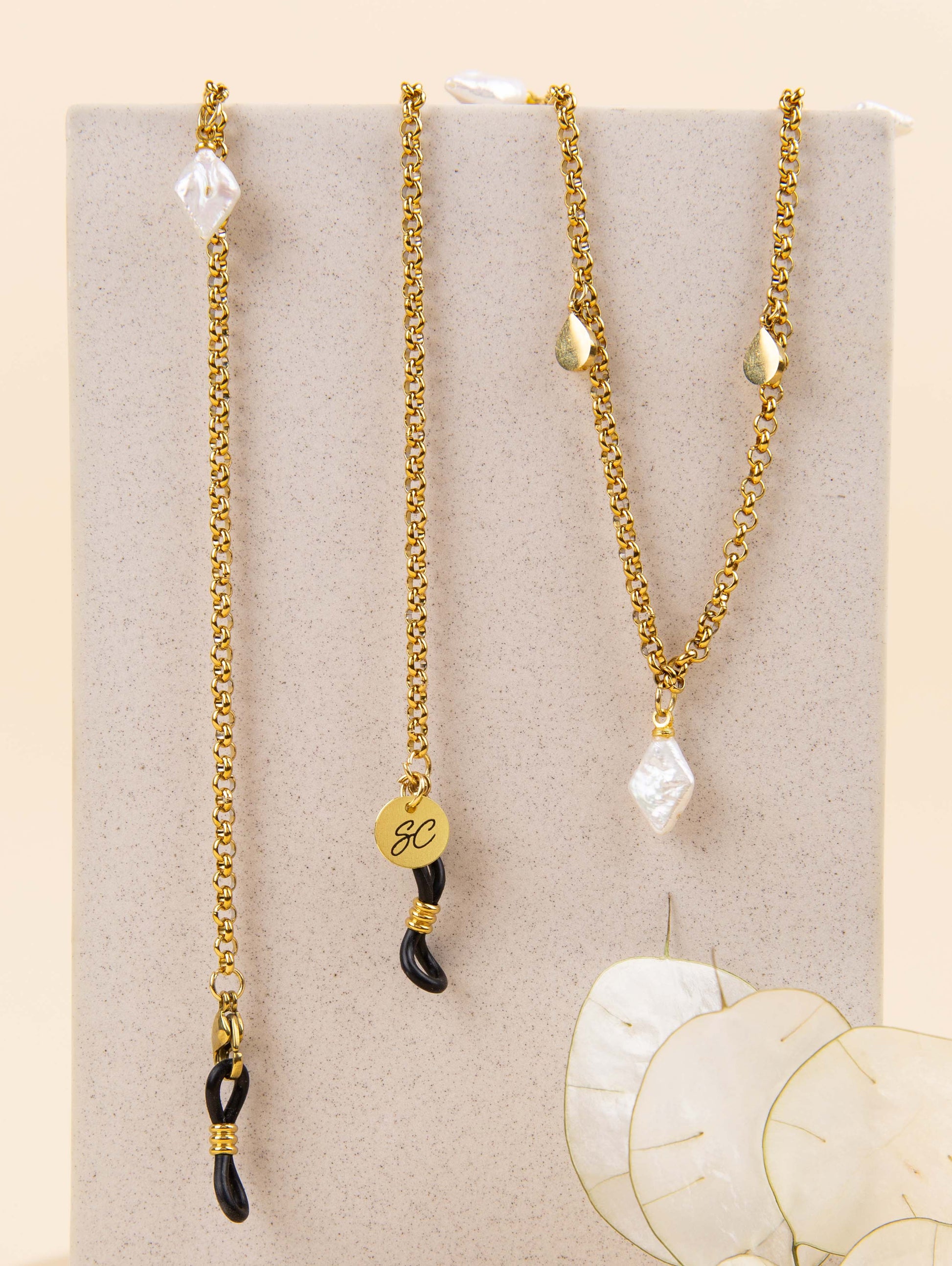 Introducing the sunglasses chain Ann, the timeless beauty. The Sunny Cord is designed with a combination of diamond shaped pearls and gold plated charms. Each pearl glisters, while the shimmering gold charms add a touch of luxury to any outfit.