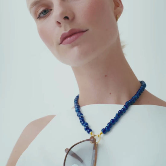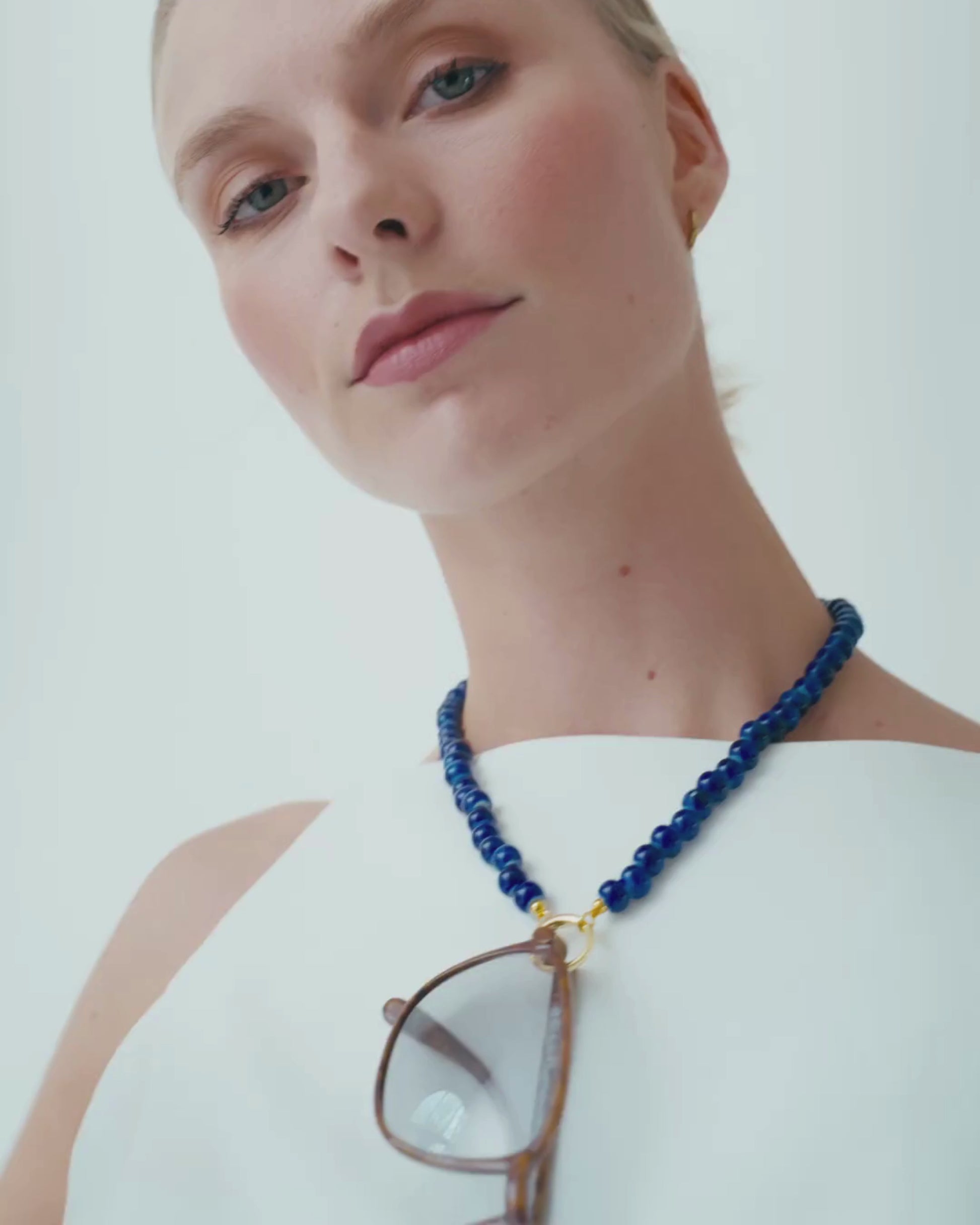 The Ceramico Azul Eyewear Necklace is where elegance meets everyday function. Crafted with deep blue ceramic beads and a gold-plated stainless-steel ring, it’s designed to hold your glasses in style. The 18 mm ring fits almost all eyewear legs, making it both practical and chic. Available in 45 cm for a close fit.