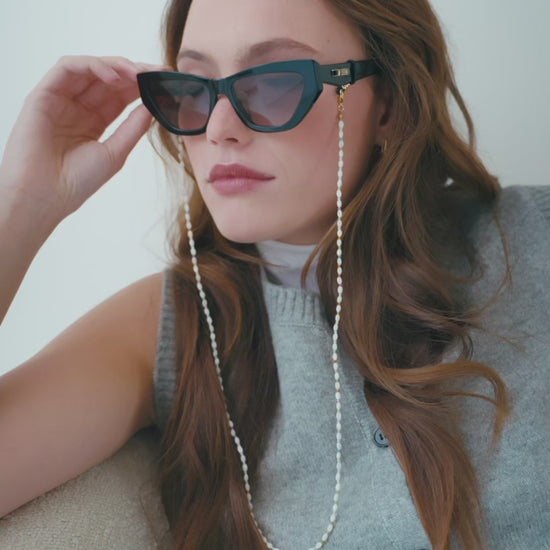 Add a touch of elegance to your everyday look with the Elvie glasses chain. Crafted by Sunny Cords, this refined design features crystal and glass cone beads intertwined with an 18K gold-plated chain. Perfect for both glasses and sunglasses, Elvie turns practicality into pure sophistication.