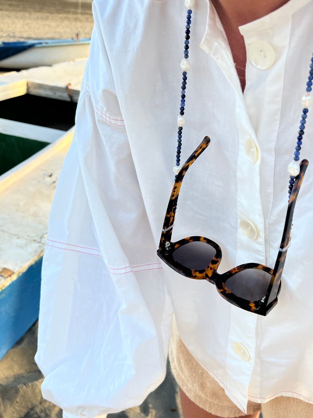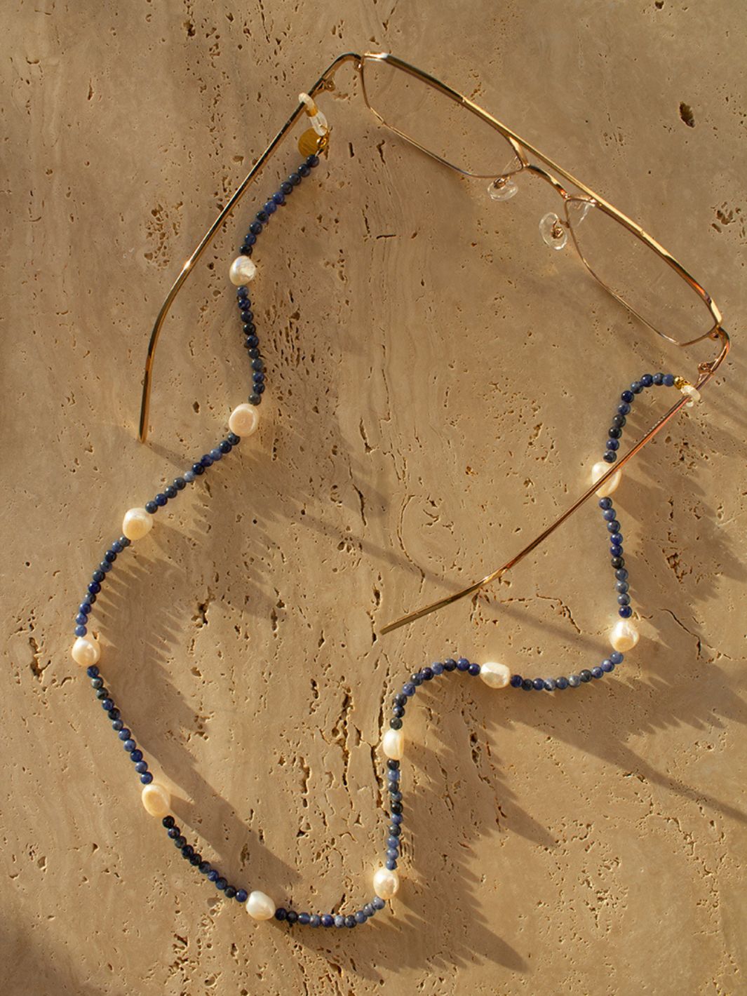 The name of this blue gemstones beauty is actually Lapis Lazuli, how cool is that! This glasses cord is a real eyecatcher and the azure blue color is so intense. The gemstones represent spiritual power, wisdom and inner peace. A very powerful sunny cord if you ask us.