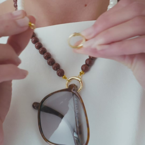 Elegant and timeless, the Pearly Eyewear Necklace is handcrafted with sweetwater pearls and finished with a gold-plated ring. Both functional and feminine, it keeps your glasses close in the most stylish way. The 18 mm ring fits almost any frame.